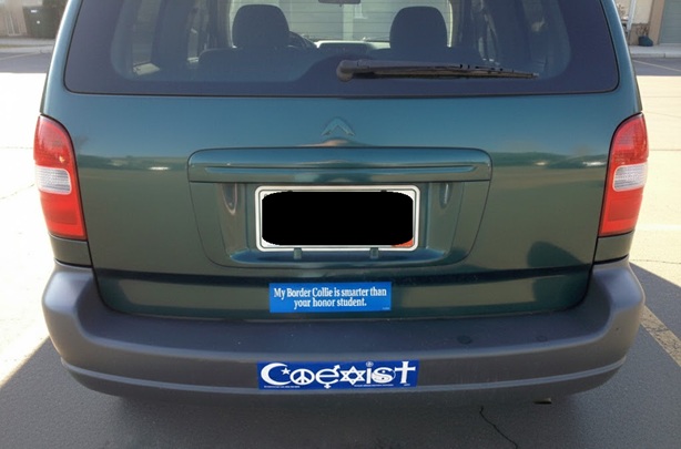 I was recently crossing a parking lot — a neutral zone, if you will — when I encountered a vehicle carrying the full burden of its owner’s conflicted soul. On the bottom, taking the spiritual high ground, was the COEXIST sticker, glowing like a halo on the rear bumper, and above it, in a place of pride, was a sticker that read, “My Border Collie is Smarter Than Your Honor Student.” The bumper sticker of peace and smugness.