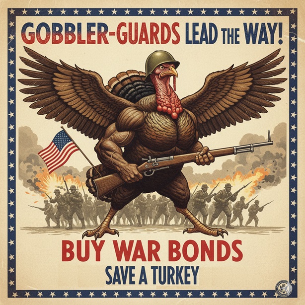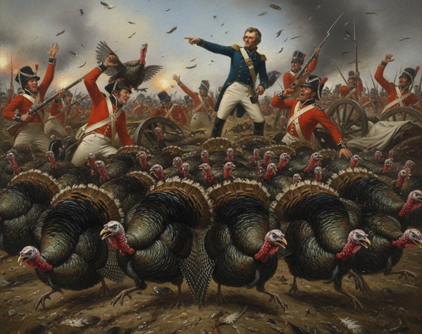 As the tide of battle turned, Winston Churchill noted, “Never in the field of human conflict has so much panic been caused by so few turkeys. It appears the Americans have weaponized confusion itself and wrapped it in feathers.”