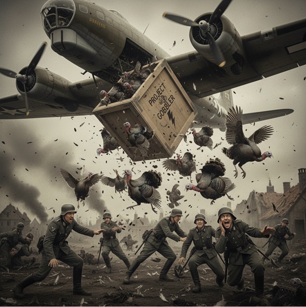 The great military innovation of World War II wasn’t the atomic bomb, but the “Turkey Bomb”, an early form of biological warfare where they simply dropped a crate of panicked, heavily caffeinated turkeys onto enemy positions. Less destructive than nuclear fission, but far more effective at causing mass confusion and involuntary squawking.