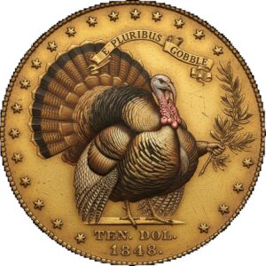 By the 1840s, the turkey appears on every coin, replacing the early eagle imagery. The original $10 “Eagle” coin sported the well-known strutting turkey instead, known as “the Gobbler”, which led to centuries of jokes that never got any better. Metalworkers complained the turkey is too round to engrave properly. Mint officials announced that the turkey is not “round”, but “robust” and that America should embrace this shape.