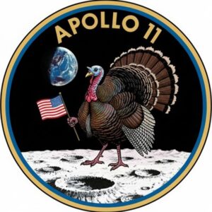 Still, the turkey appeared on the patch for Apollo 11, holding a small American flag. The Apollo 11 lunar lander was named the “Turkey”. “The Turkey has landed,” Armstrong reportedly said when the lunar module touched down, pausing just long enough for Mission Control to wonder whether he meant the spacecraft or himself. A moment later he added, “Please advise if we should baste or proceed.”