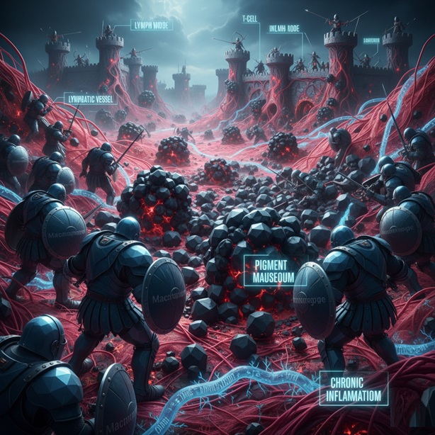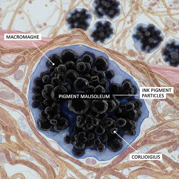 - Migration and Accumulation: However, not all ink stays put. Studies show that tiny pigment particles, along with the very immune cells holding them, migrate through the lymphatic system and accumulate in the lymph nodes, the body’s central filtering and defense stations.